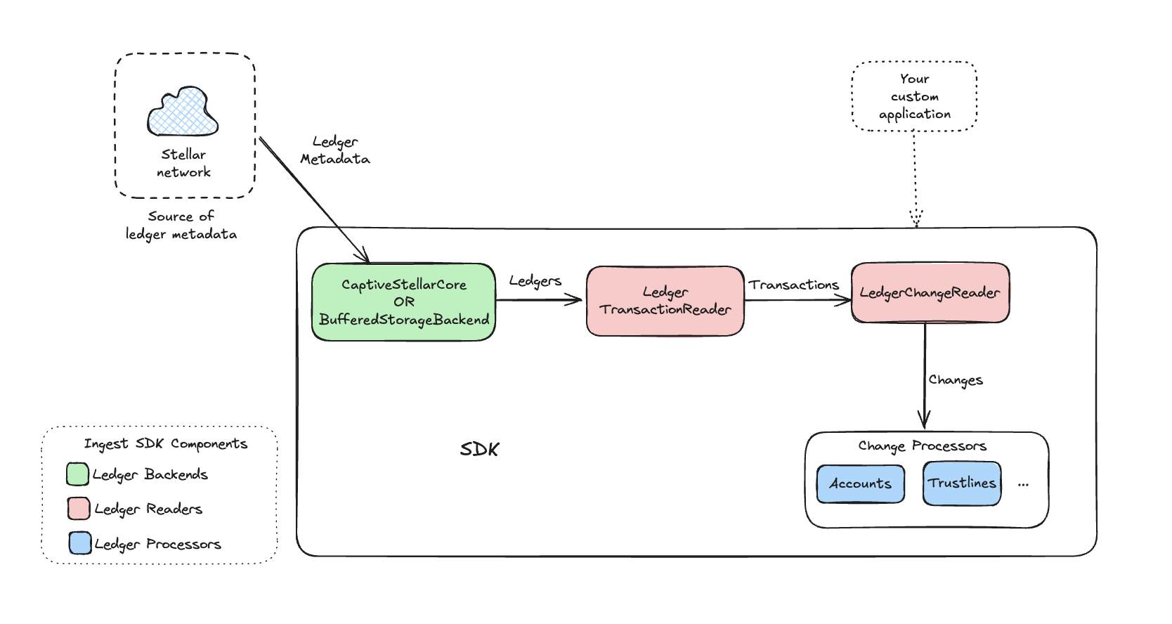 - Ledger Backends: Used to stream ledgers from the Stellar network.